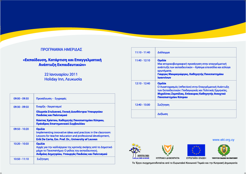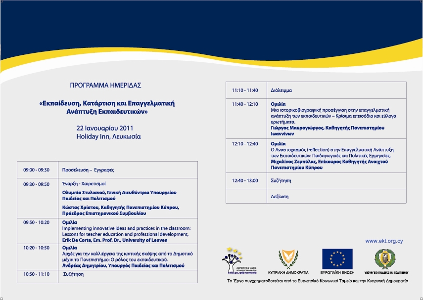 Το Υπουργείο Παιδείας και Πολιτισμού διοργανώνει ημερίδα με θέμα «Εκπαίδευση, Κατάρτιση και Επαγγελματική Ανάπτυξη Εκπαιδευτικών», το Σάββατο, 22 Ιανουαρίου 2011, από τις 9:30π.μ. μέχρι τις 1:00 μ.μ., στο ξενοδοχείο Holiday Inn στη Λευκωσία.