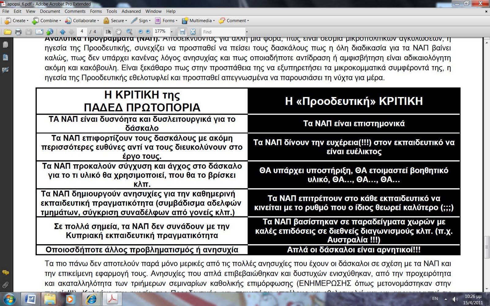 Η ΠΑΔΕΔ Πρωτοπορία στο ενημερωτικό της έντυπο «Άποψη» (ημερομηνίας 4 Απριλίου 2011), παραθέτει άρθρο με τίτλο: «Νέα Αναλυτικά Προγράμματα: Πες ένα ψέμα 100 φορές και στο τέλος το πιστεύεις και εσύ ο ίδιος». Στο συγκεκριμένο άρθρο, για ακόμα μια φορά, η ΠΑΔΕΔ Πρωτοπορία επιτίθεται στην Προοδευτική με χαρακτηρισμούς όπως: «…δέσμια μικροπολιτικών αγκυλώσεων…», «…στην προσπάθειά της να εξυπηρετήσει τα μικροκομματικά συμφέροντά της…». Στο ίδιο άρθρο παρουσιάζεται πίνακας, στον οποίο γίνεται σύγκριση της κριτικής της ΠΑΔΕΔ για τα ΝΑΠ με αυτήν της Προοδευτικής. Πιο κάτω παραθέτω τον εν λόγω πίνακα αυτούσιο.