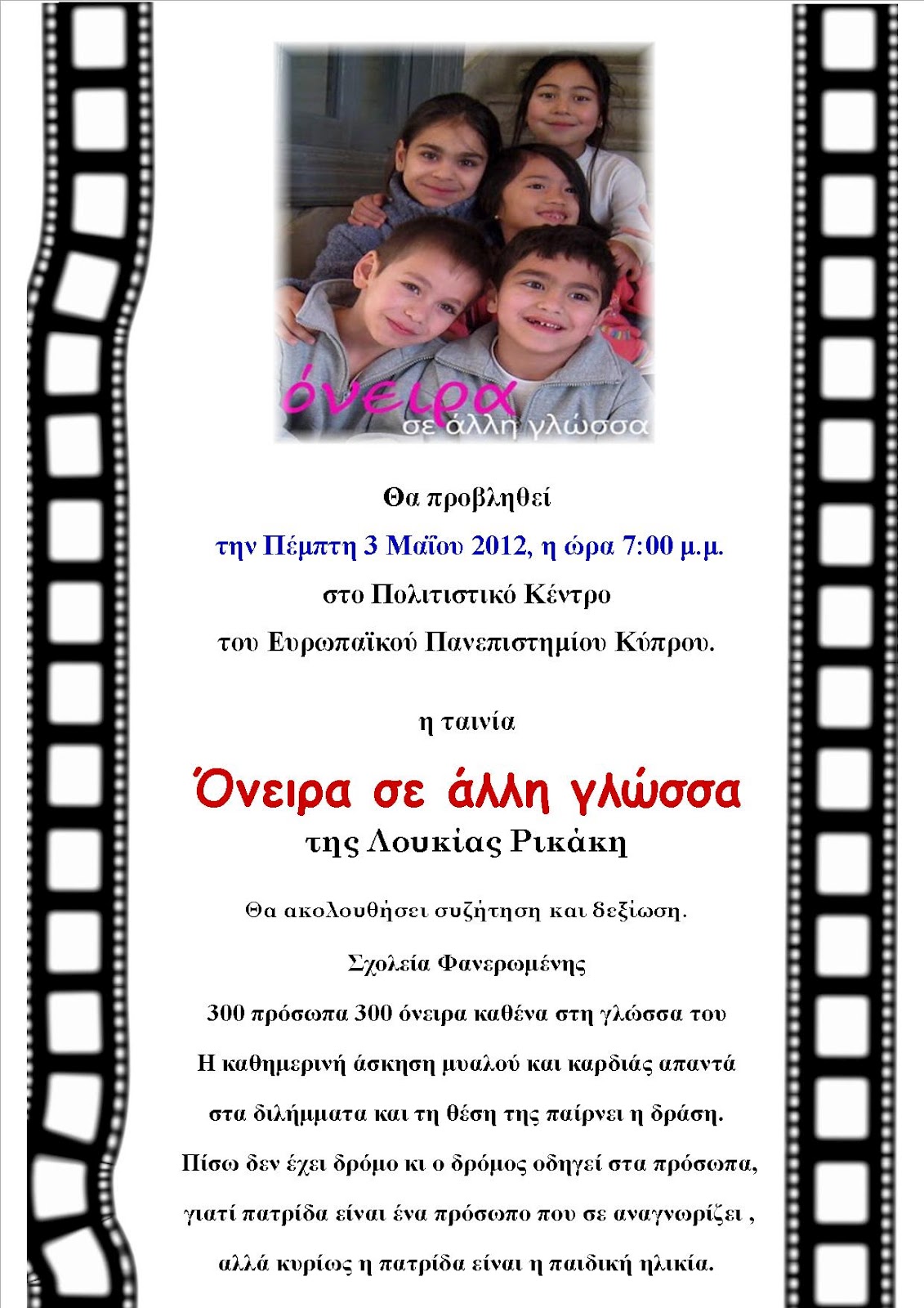 “Όνειρα σε άλλη γλώσσα”, προβολή ταινίας. Το Ευρωπαϊκό Πανεπιστήμιο Κύπρου σε συνεργασία με το Δημοτικό Σχολείο Φανερωμένης προβάλλει την ταινία “Όνειρα σε άλλη γλώσσα” την Πέμπτη 3 Μαΐου 2012 η ώρα 7μ.μ. στο Πολιτιστικό Κέντρο του Ευρωπαϊκού Πανεπιστημίου Θα ακολουθήσει συζήτηση και δεξίωση. Η προβολή είναι αφιερωμένη στη μνήμη της σκηνοθέτριας Λουκίας Ρικάκη. By Admin|2016-10-21T19:39:52+02:003 Μαΐου, 2012|Categories: Εκδηλώσεις|0 Σχόλια Share , Choose Your Platform! FacebookTwitterLinkedInPinterestEmail Σχετικά Άρθρα Στον αστερισμό της αξιολόγησης : Ενιαίο Σχέδιο Αξιολόγησης Gallery Στον αστερισμό της αξιολόγησης : Ενιαίο Σχέδιο Αξιολόγησης 27 Φεβρουαρίου, 2020 ΑΥΤΙΣΜΟΣ – Κλινική εικόνα και διαχείριση συμπεριφορών Gallery ΑΥΤΙΣΜΟΣ – Κλινική εικόνα και διαχείριση συμπεριφορών 18 Ιανουαρίου, 2020 ΤΟ ΠΑΡΑΜΥΘΙ ΩΣ ΜΕΣΟ ΑΝΑΠΤΥΞΗΣ ΣΥΝΑΙΣΘΗΜΑΤΙΚΗΣ ΝΟΗΜΟΣΥΝΗΣ Gallery ΤΟ ΠΑΡΑΜΥΘΙ ΩΣ ΜΕΣΟ ΑΝΑΠΤΥΞΗΣ ΣΥΝΑΙΣΘΗΜΑΤΙΚΗΣ ΝΟΗΜΟΣΥΝΗΣ 13 Ιανουαρίου, 2020 Καλό ταξίδι Θάνο… Gallery Καλό ταξίδι Θάνο… 29 Δεκεμβρίου, 2019 Eκπαιδευτικό συνέδριο με θέμα «Δε φταίω εγώ… Στρατηγικές για τη διδασκαλία της υπευθυνότητας» Gallery Eκπαιδευτικό συνέδριο με θέμα «Δε φταίω εγώ… Στρατηγικές για τη διδασκαλία της υπευθυνότητας» 9 Νοεμβρίου, 2019